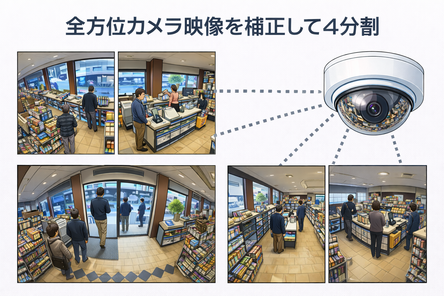 映像は魚眼レンズのように歪みがありますが、ソフト処理で補正可能です。また魚眼レンズのような全体が分かる映像から4分割、8分割し、通常の防犯カメラ画像のような出力もできるようになっています。