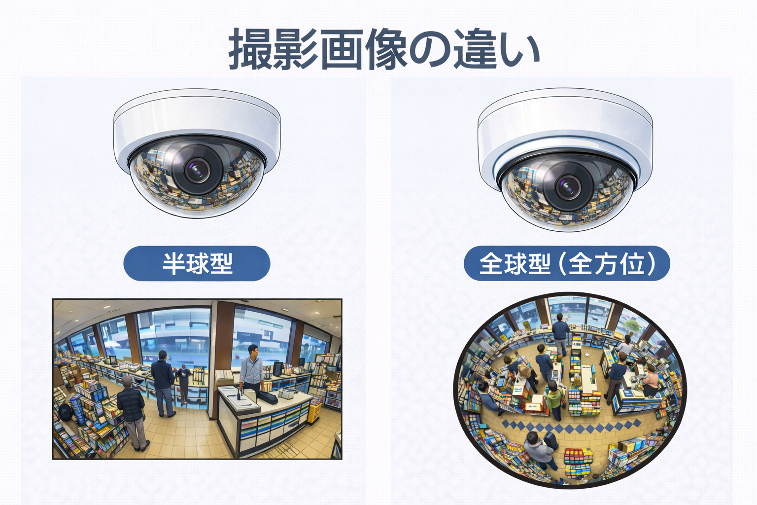 | 半球型 | 前方メインの撮影。壁面設置にも対応しやすい。 | 出入口やレジなど、明確な撮影方向がある場所 |