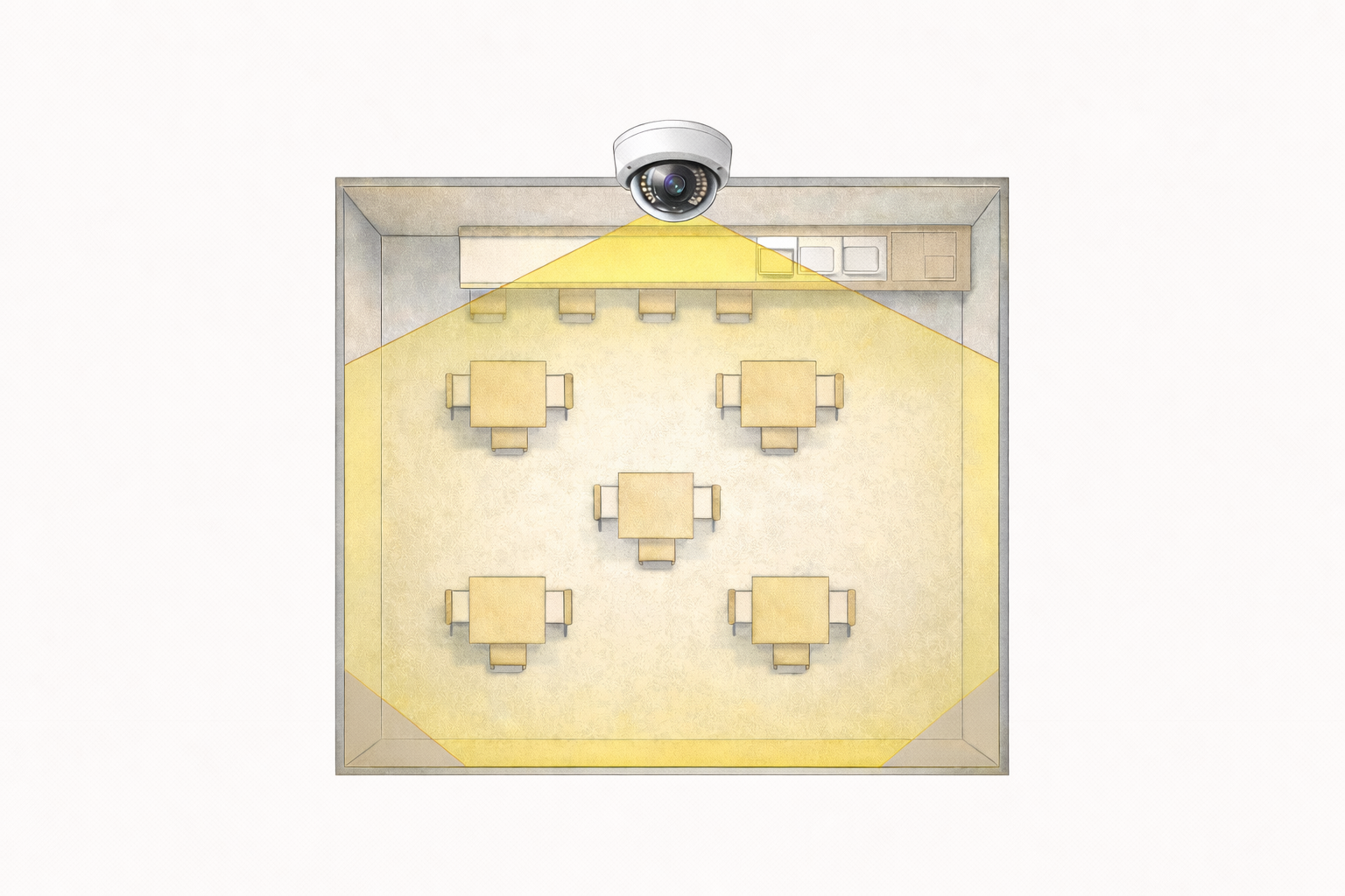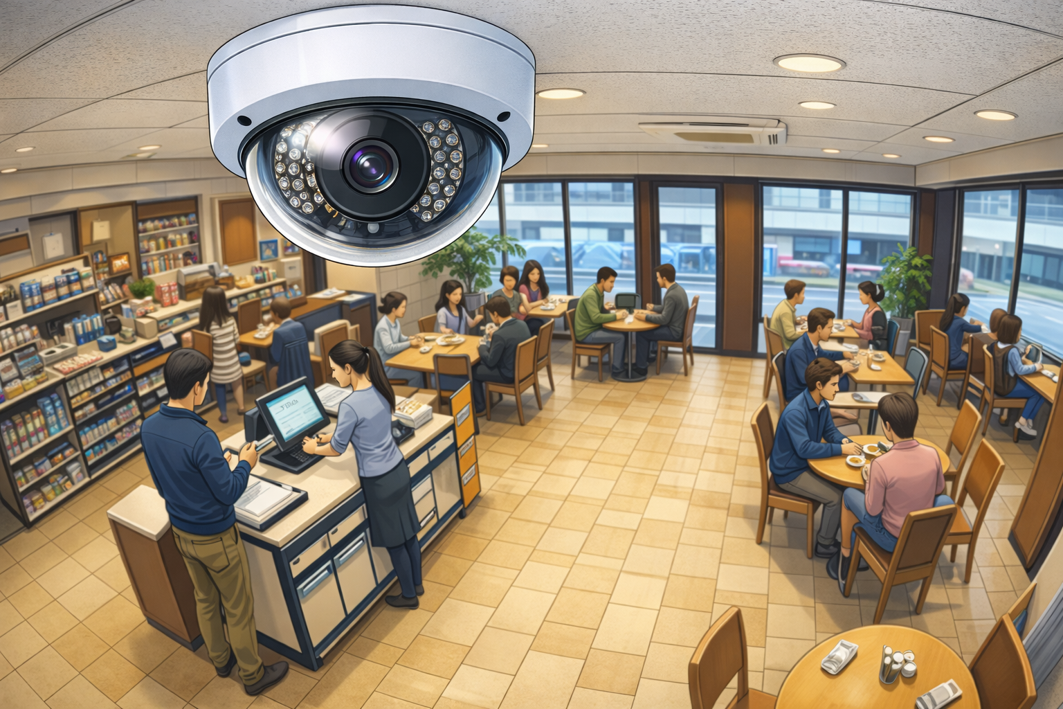 特に天井中央に設置した場合、死角が極めて少なくなり、1台で複数の出入口やカウンターを同時にカバーすることも可能です。