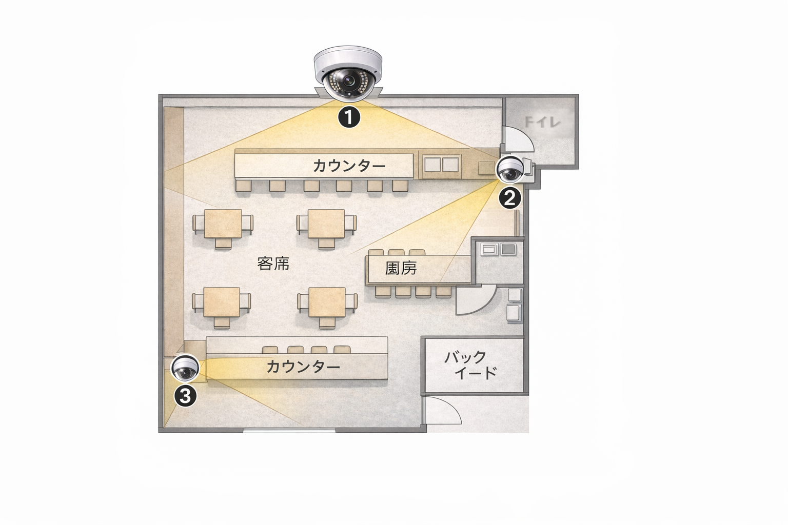 | 飲食店 | 天井中央+レジ+入口 | 広範囲+人物特定の両立 |