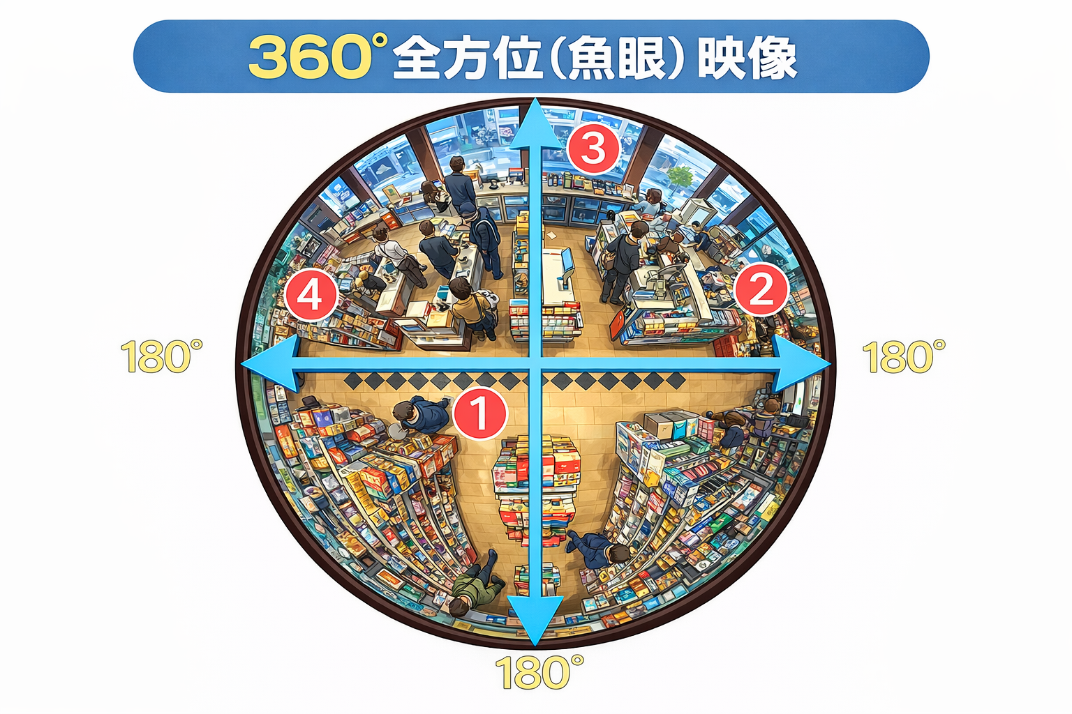 つまり1台の防犯カメラを天井に設置すれば、全方位を見渡すことも可能となるんです。